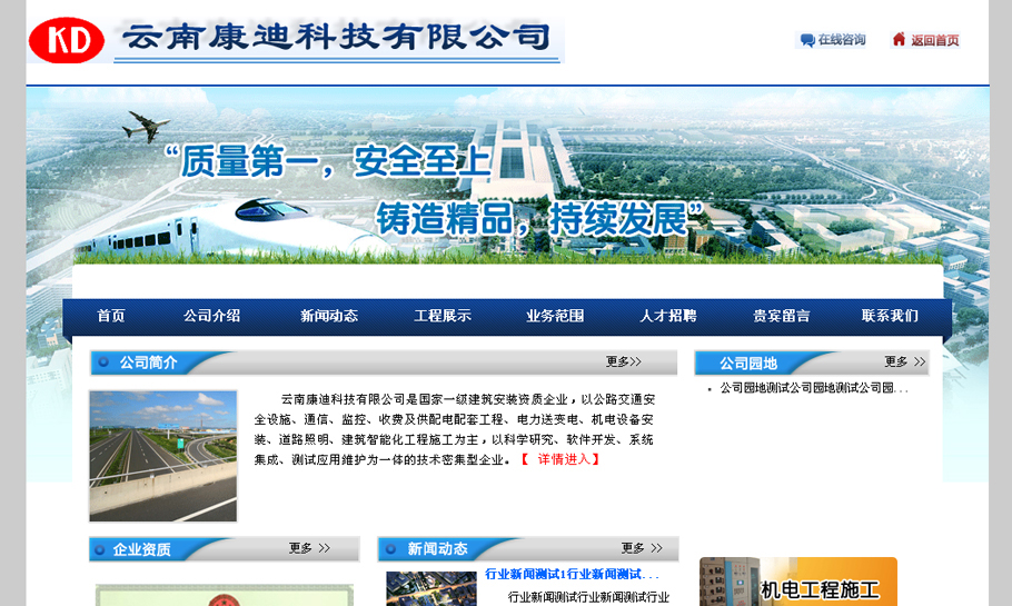 云南康迪科技有限公司是国家一级建筑安装资质企业,以公路交通安全设施、通信、监控、收费及供配电配套工程、电力送变电、机电设备安装、道路照明、建筑智能化工程施工为主,以科学研究、软件开发、系统集成、测试应用维护为一体的技术密集型企业。