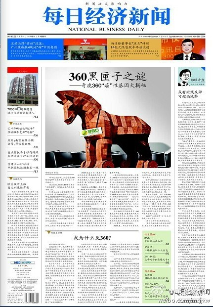 《每日经济新闻》刊登了一篇头版文章:《360黑匣子之谜——奇虎360“癌”性基因大揭秘》(点击阅读原文),文章从奇虎360所有APP产品被苹果全面下架开始说起,引用了多位号称微博“独立调查员”的技术人士的叙述,将奇虎360旗下多款产品在市场的成功称之为“癌性浸润”。这篇文章在网络上引起了轩然大波,文章在各大门户网站及微博、QQ空间等社交网络上多次被转载,引发了网友们激烈的讨论。