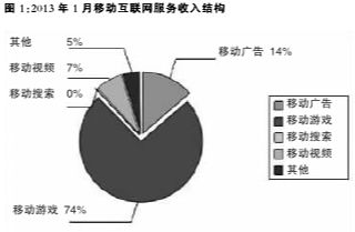 3. 移动互联网服务收入下降。1月,移动互联网服务收入达1.63亿元,较去年同期下降41.1%。其中,移动游戏收入增幅43%,但无法弥补移动广告收入下滑87.2%带来的总收入下跌幅度。移动搜索服务占比不足2%,尚有很大发展空间(见图1)。