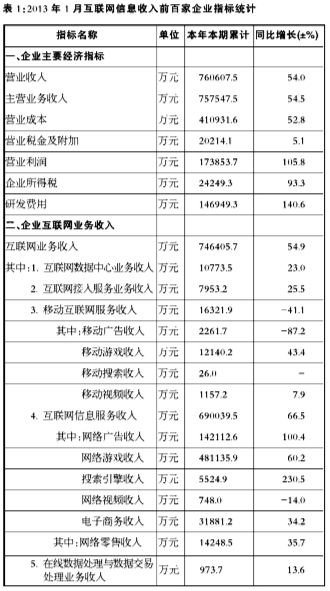 宽带基础设施加速、3G和WiFi热点建设加速、智能终端普及,推动互联网设施和服务环境的完善,推动互联网信息服务市场发展迅猛。2013年1月,重点调度联系的互联网信息服务收入百家企业收入增势显著。受春节前企业与合作方结算的影响,部分财务指标较去年有较大波动。