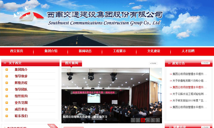 发布时间:2013-03-28 10:45:00 点击:西南交通建设集团股份有限公司是集公路、铁路、水利水电、矿山工程开采、房地产开发等业务于一体的省属国有大型企业。集团公司前身为1948年组建的工程兵部队,至今走过了六十年的光辉历程,在战争年代参加过解放战争和南疆作战。进入改革开放年代后,公司积极投身国家和云南省的重点基础设施建设等业务,为省内外的经济发展做出了巨大贡献。1998年11月30日,整体转业移交给云南省交接办,2001年4月移交给云南省企业工委,2004年2月移交给云南省国有资产监督管理委员会管理。2006年8月1日改制成立西南交通建设集团有限公