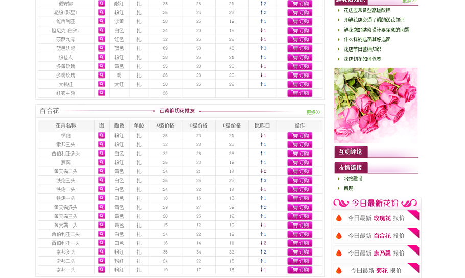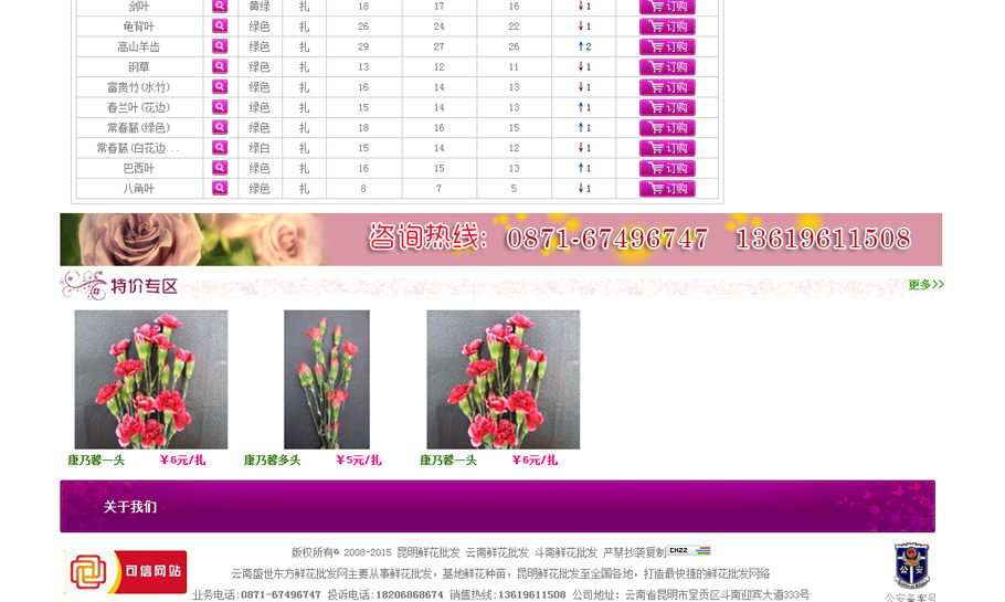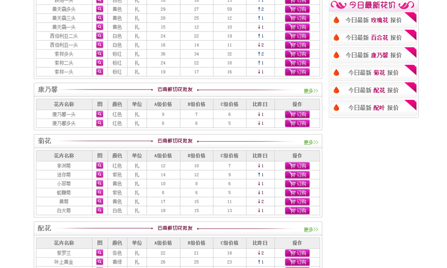 发布时间:2013-04-30 19:53:00 点击:盛世东方鲜切花批发网(http://www.ynssdf.com )位于云南最大的鲜花批发市场,从事斗南鲜花批发、昆明鲜花批发、云南鲜花批发,全国范围批发各种鲜花,昆明、云南、斗南最大的鲜花批发市场。我们经营的鲜花花种花色齐全,配花配叶种类多。高中低档鲜花,全国范围内配送,即日可达。 本网站最大特点为鲜花价格更新频率快,完全实现实时更新,方便客户浏览决定。 根据盛世东方的个性要求,Esun网络精心策划网站功能,务必实现完全定制之初衷!