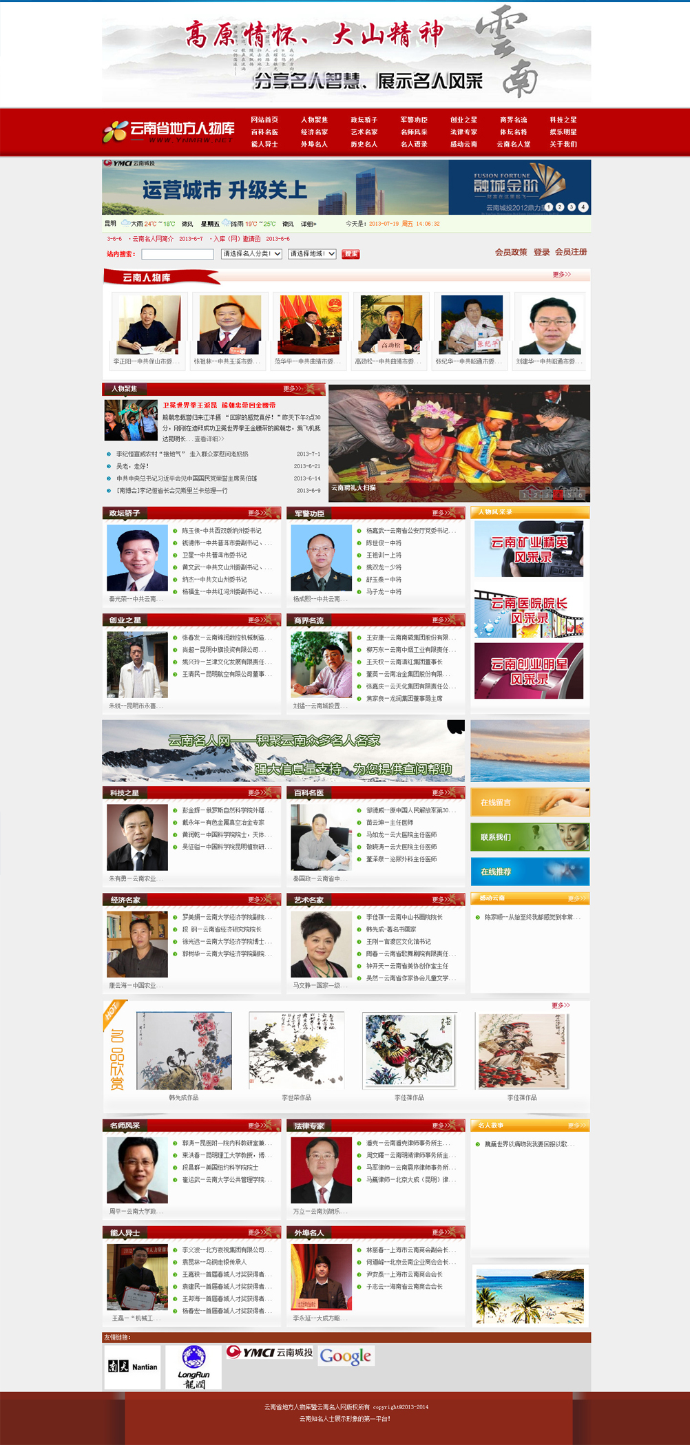 云南名人网是以记录和反映社会各行业尤其是优秀企事业单位管理者、领导人等先进事迹及所在行业的发展变化为主线。一个个市长、县委书记、县长、局长、校长、院长、董事长、厂长、经济带头人、但他们无疑又是行业的精英、在当地和本行业具有一定的典型代表,都是些脚踏实地的勤劳之人,是物质文明和精神文明的具体创造者,更是时代的大众英雄。