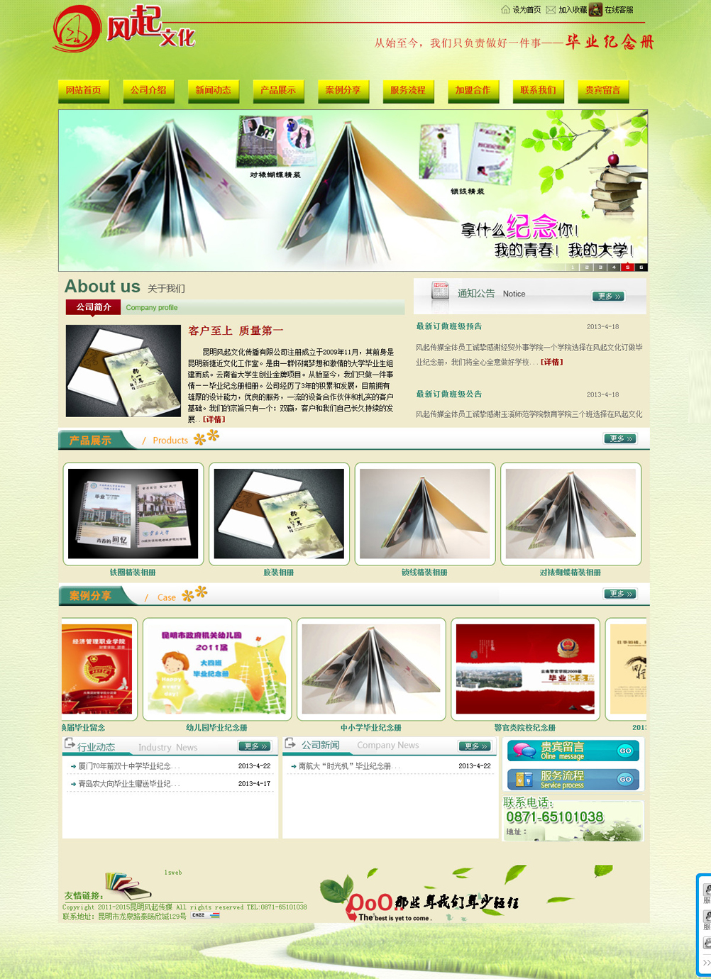 发布时间:2013-08-24 15:15:00 点击:昆明风起文化传播有限公司注册成立于2009年11月,其前身是昆明新捷近文化工作室。是由一群怀揣梦想和激情的大学毕业生组建而成。云南省大学生创业金牌项目。从始至今,我们只做一件事情——毕业纪念册相册。公司经历了3年的积累和发展,目前拥有雄厚的设计能力,优良的服务,一流的设备合作伙伴和扎实的客户基础。我们的宗旨只有一个:双赢,客户和我们自己长久持续的发展,这是我们的动力,也是我们生存的根本。我们以热情、专注、高效、负责、节约的精神和态度为客户提供全方位的服务,我们将自己定位成:“与客户沟通发展,并肩前进的同路