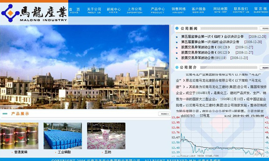 发布时间:2013-02-17 23:18:00 点击:云南马龙产业集团股份有限公司,是立足云南省特有的资源优势,通过产业整合重组而发展起来的大型磷化工企业集团,是云天化集团有限责任公司发展磷化工产业的重要平台。 公司前身是创建于1978年的云南马龙化建股份有限公司,是全国黄磷行业最早的上市公司(股票代码600792)。公司拥有两个黄磷生产基地,一个磷化工产业发展平台,一个专业营销物流公司等6家分、子公司的产业性企业,拥有中国全部单台年生产设计能力最大(3万吨/年)、最先进的黄磷生产电炉。黄磷生产能力达16.65万吨,位列全国第一;磷酸(85%)生产能力达3