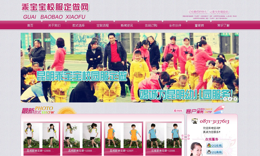乖宝宝校服定做网为西南各学校、幼儿园提供校服设计、定做服务。目前已成功为云南十余所学校幼儿园提供了款式美观质量上乘的服装。