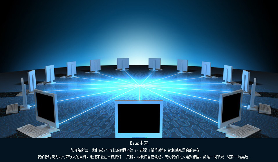 Esun从8年前的工作室发展到今天在本土颇有影响力的网络公司,一直保持了高速发展的势头。这一切,都源于在成立初期的Sun定位、客户的认可支持及我们同事的共同努力!互联网在很长一段时间内都很神秘,甚至于和美国科幻大片相提并论。所以,就有很多急功近利的从业人员和公司利用这种神秘感不断吹嘘夸张,浑水摸鱼...这样做的恶果显而易见,导致了市场的混乱,客户信心的丧失,以至于曾经有一段时间只要提到网络公司便会被人恶语相向!